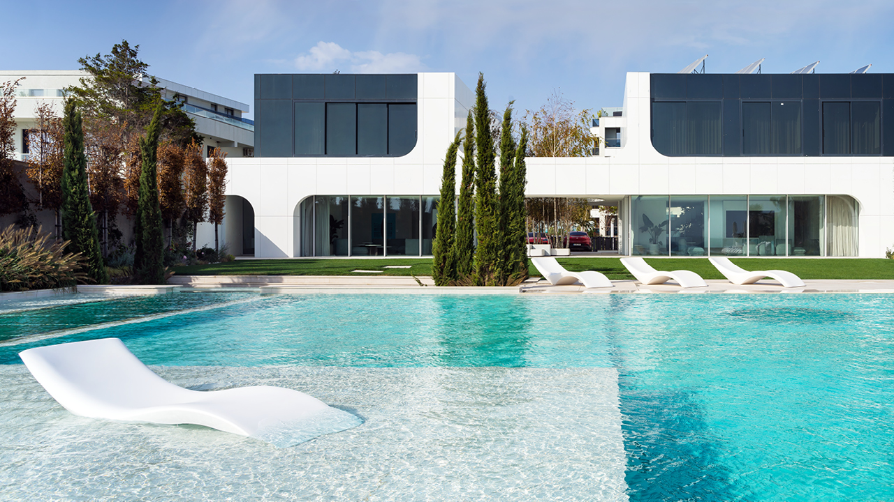On the horizontal levels of this villa, we can determine 3 distinct areas: the front lawn, the building and the backyard. Then we travel 32 steps down to discover the pool, which descends with the land into the sea. The cross-ends of the property preserve its intimacy through high concrete walls and linear vegetation.